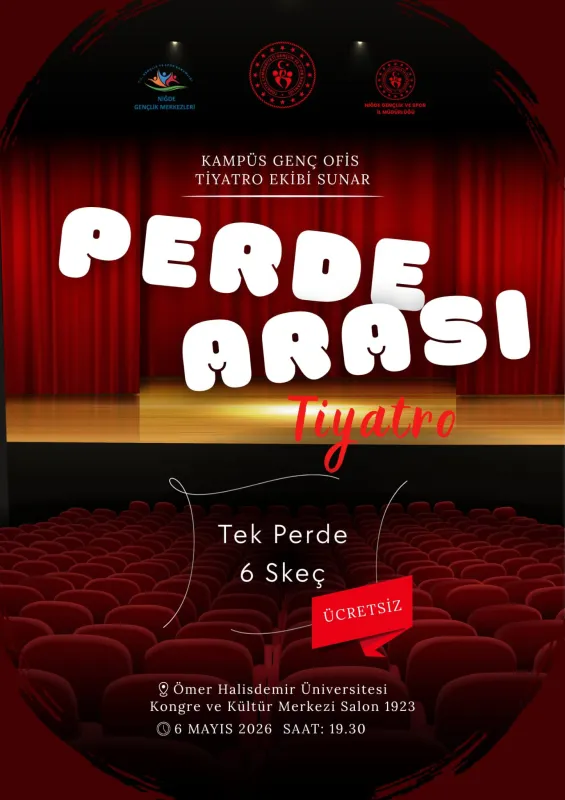 Kampüs Genç Ofis tiyatro ekibinin hazırlamış olduğu 6 skeç komedi tiyatro oyunu 6 Mayıs 2026 saat 19:30'da Niğde Ömer Halisdemir Üniversitesi Kongre ve Kültür Merkezi Salon 1923'te seyircisi ile buluşacak.